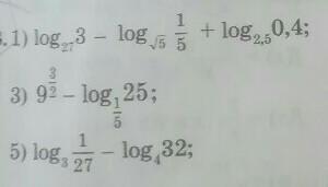 log_{27}3-log_{sqrt{5} }frac{1}{5}+log_{2.5}0.4=log_{3^3}3-log_{5^frac{1}{2}}5^{-1}+log_{frac{5}{2}}frac{2}{5}==frac{1}{3}log_33-(-1)*2log_55+log_{(frac{2}{5})^{-1} }frac{2}{5} =frac{1}{3}+2-1=1frac{1}{3}