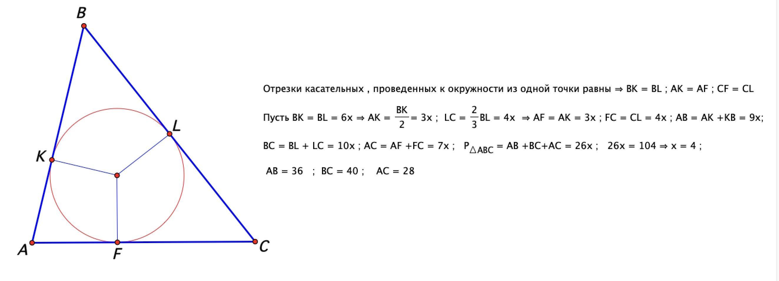 Окружность вписанная в треугольник ABC, касается стороны AB в точке K и стороны BC в точке L, при этом AK:KB=1:2, BL:LC=3:2. Периметр треугольника равен 104. Чему равны стороны?