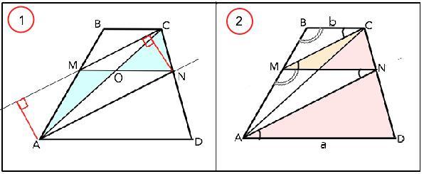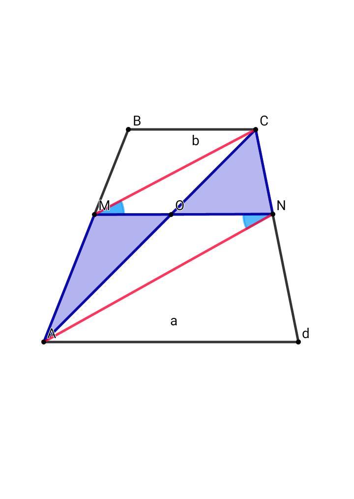 б) На основании параллельности ВС║MN║AD и MC║AN с общими секущими ∆ МВС~ ∆ АMN. Из подобия следует отношение а:MN=МС:АС. Аналогично ∆ МСN~∆AND ⇒ MN:b=MC:AC, из чего следует а:MN=MN:b и MN²=ab, ⇒ MN=√ab
