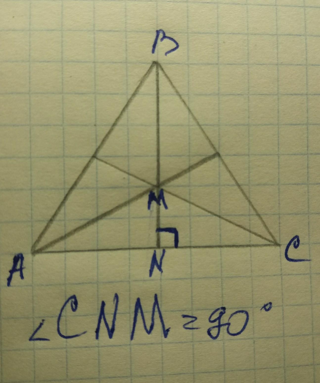 Высоты, проведённые к боковым сторонам AB и BC равнобедренного треугольника ABC , пересекаются в точке M . Прямая BM пересекает основание AC в точке N . Определи ∡CNM .