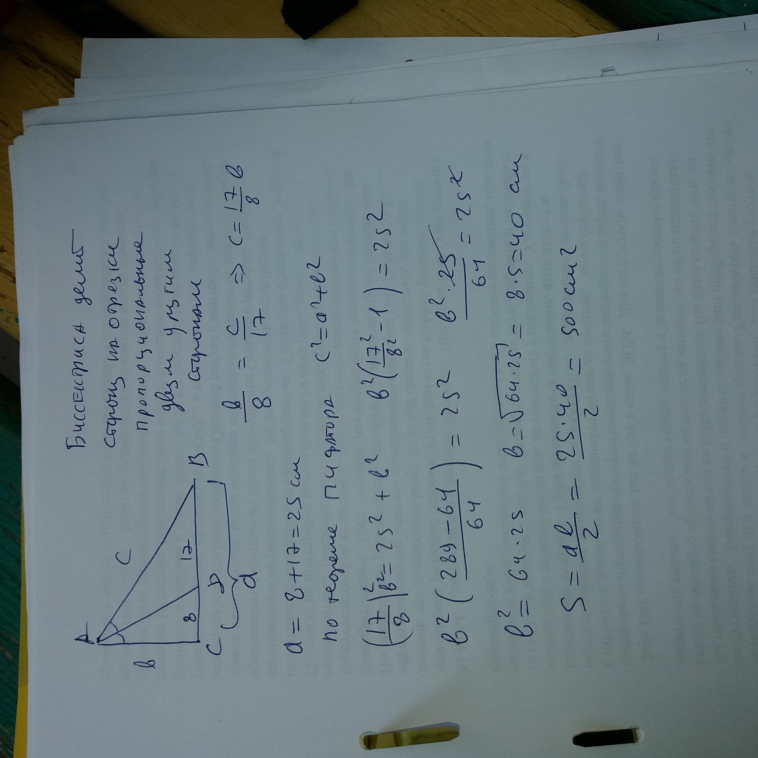 Биссектриса острого угла прямоугольного треугольника делит катет на отрезки длиной 8 см и 17 см. Найдите площадь треугольника
