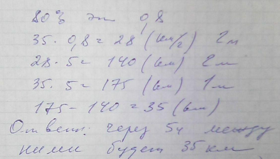 из одного пункта В одном направлении одновременно выехали два мотоциклиста Скорость одного 35 км ч а скорость другого составляла 80% скорость первого мотоциклиста Какое расстояние будет между ними через 5 часов