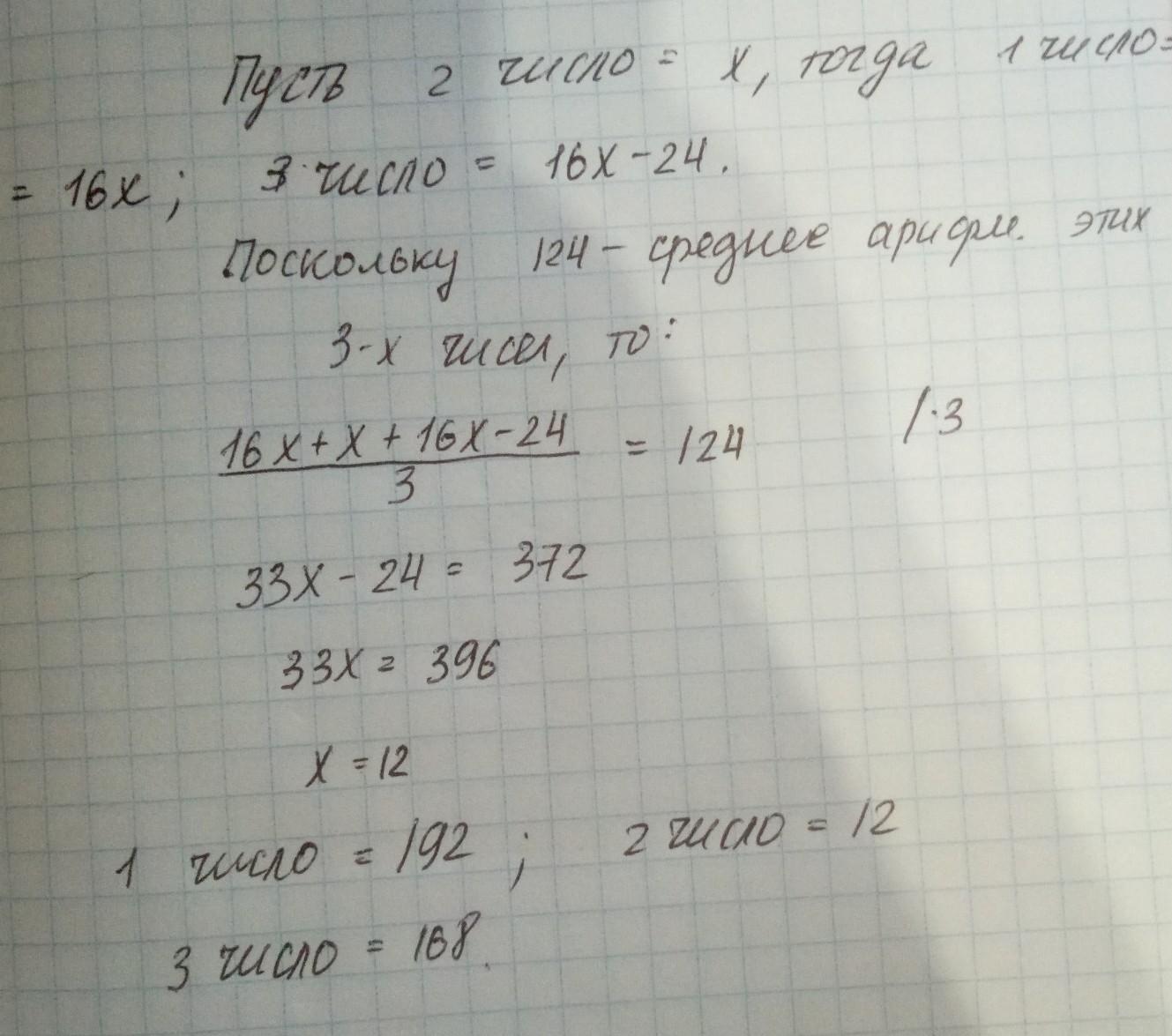 среднее арфмитическое трёх чисел равно 124.Первое число в 16 раз больше второго,а третье число на 24 меньше первого . Найдите каждое из этих чисел