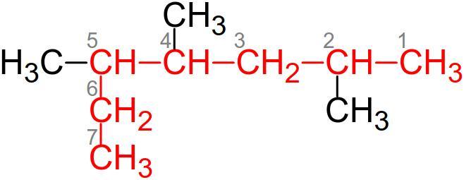 Для большей наглядности на рисунке выделена главная цепь красным цветом и углероды пронумерованы.