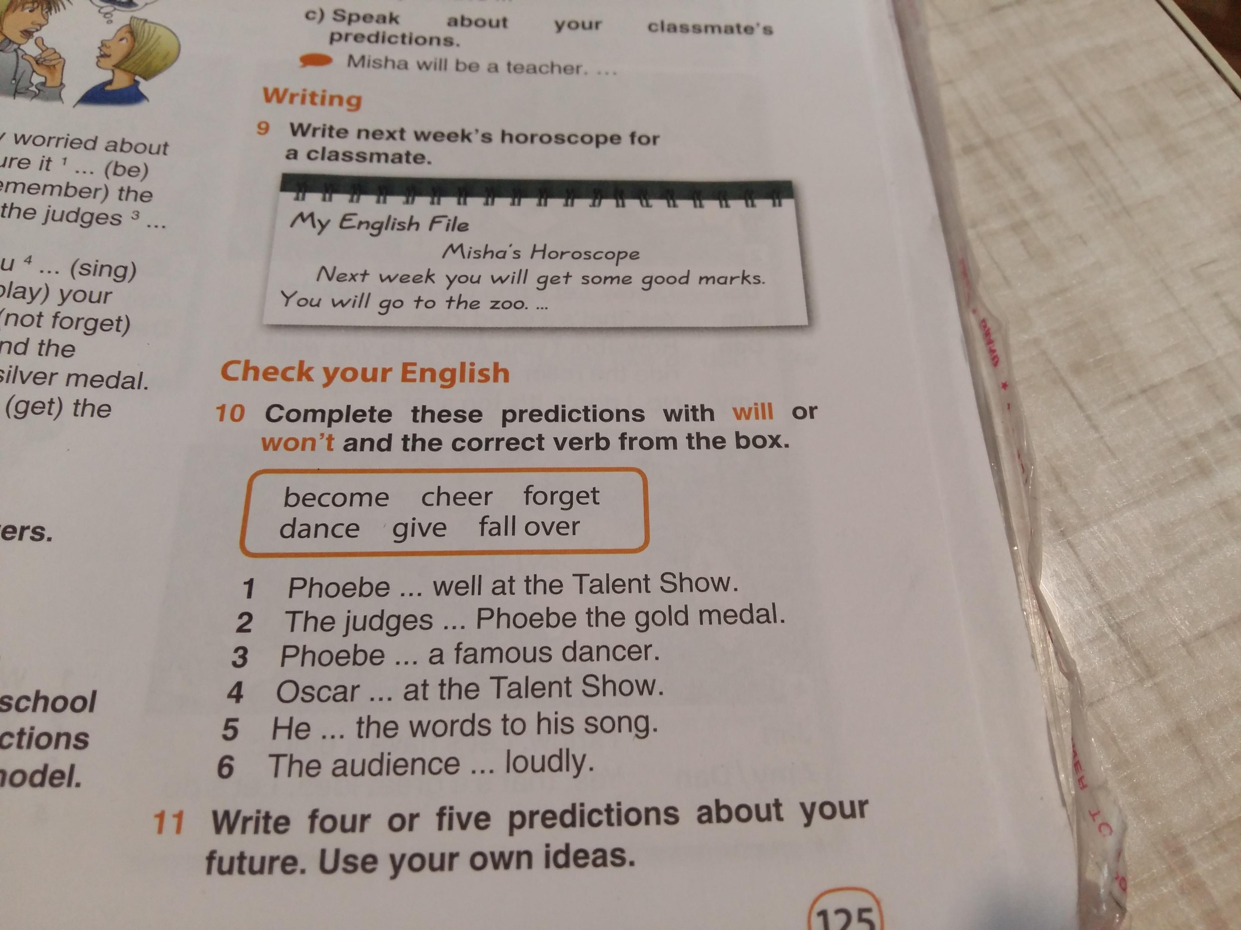 10) 1.Phoebe will dance well at the Talent Show. 2. The judges will give Phoebe the gold medal. 3. Phoebe will become a famous dancer. 4. Oscar will fall over at the talent show. 5. He will forget the words to his song. 6. The audience won’t cheer loudly
