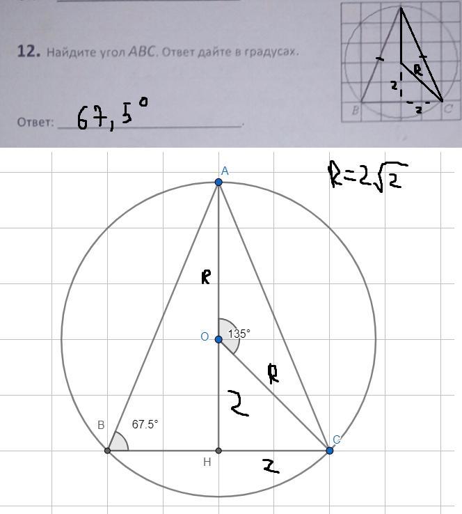 угол ABC=α/2=67,5° (так-как это вписанный угол который опирается на дугу AC)