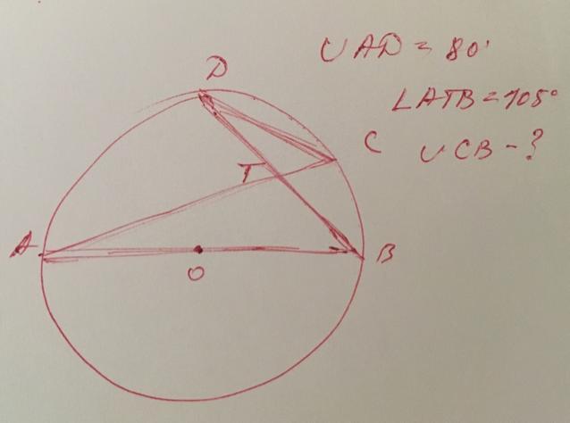 дуги равны их углам. угол CTB = 180-105=75 т.к. смежные. соответственно дуга СВ равна 75 градусам