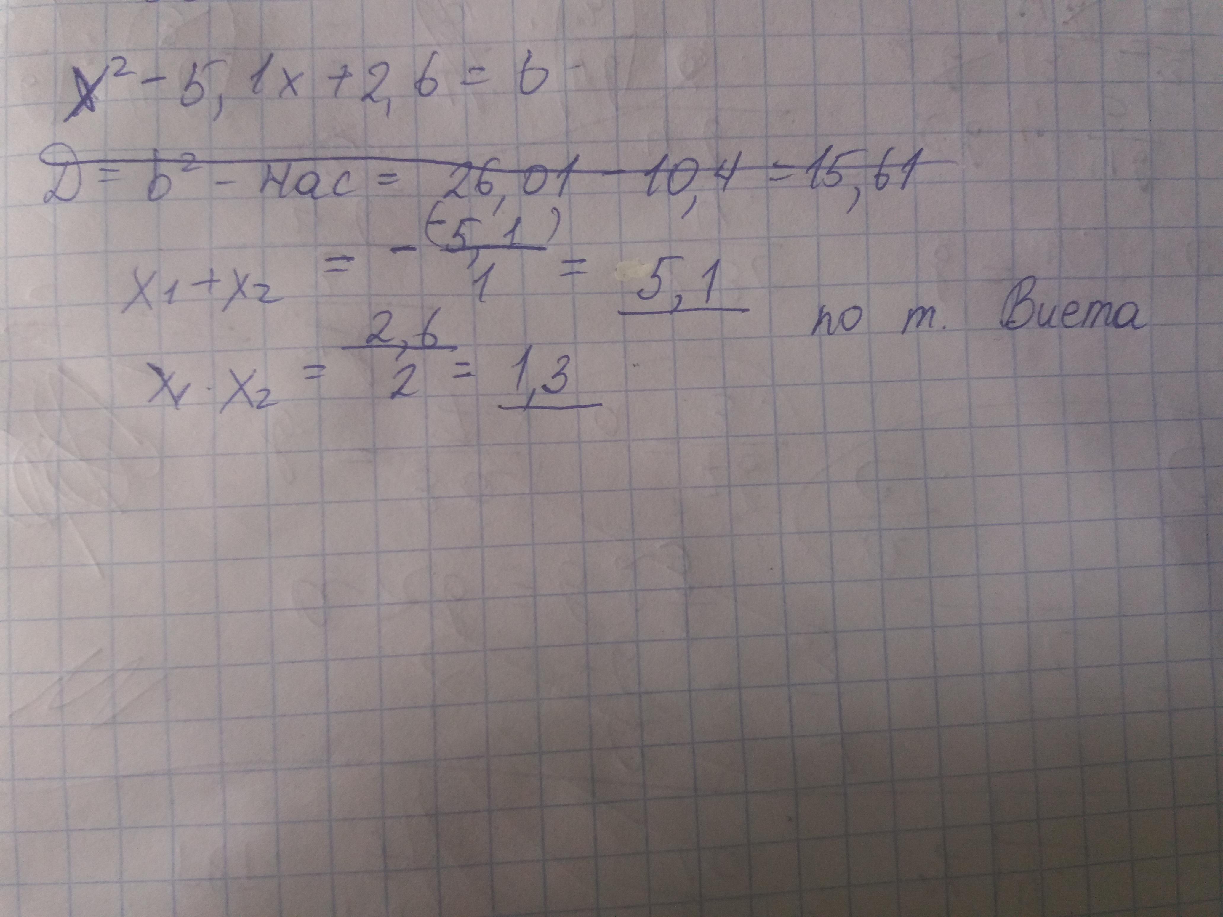 по теор. Виета х1+х2=5,1 х1*х2=2,6