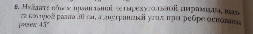 Поскольку в основании пирамиды квадрат и угол 45°, то длина перпендикуляра от точки пересечения до стороны основания равна высоте пирамиды - 30 см.