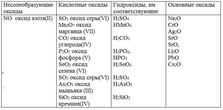 Оксиды: Na(2)O, SO(3), CrO, NO, Mn(2)O(7), CO(2), Ag(2)O, P(2)O(5). SrO, SeO(3), Li(2)O, SO(3), As(2)O(3), PbO, Cs(2)O, SiO(2).