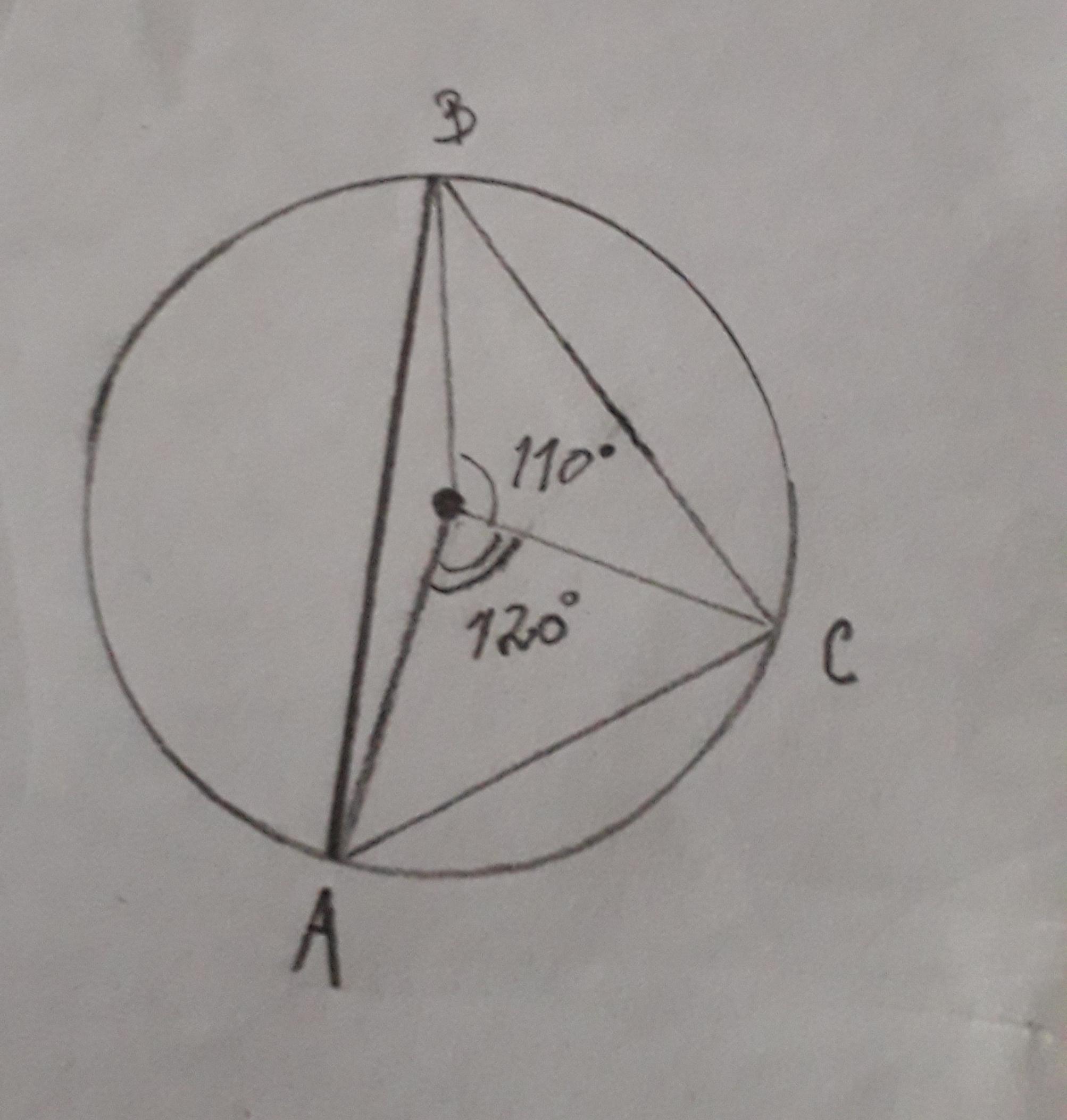 Угол BCA = 65° (т.к. дуга, на которую он опирается равна 360°-(110°+120°)=130°)