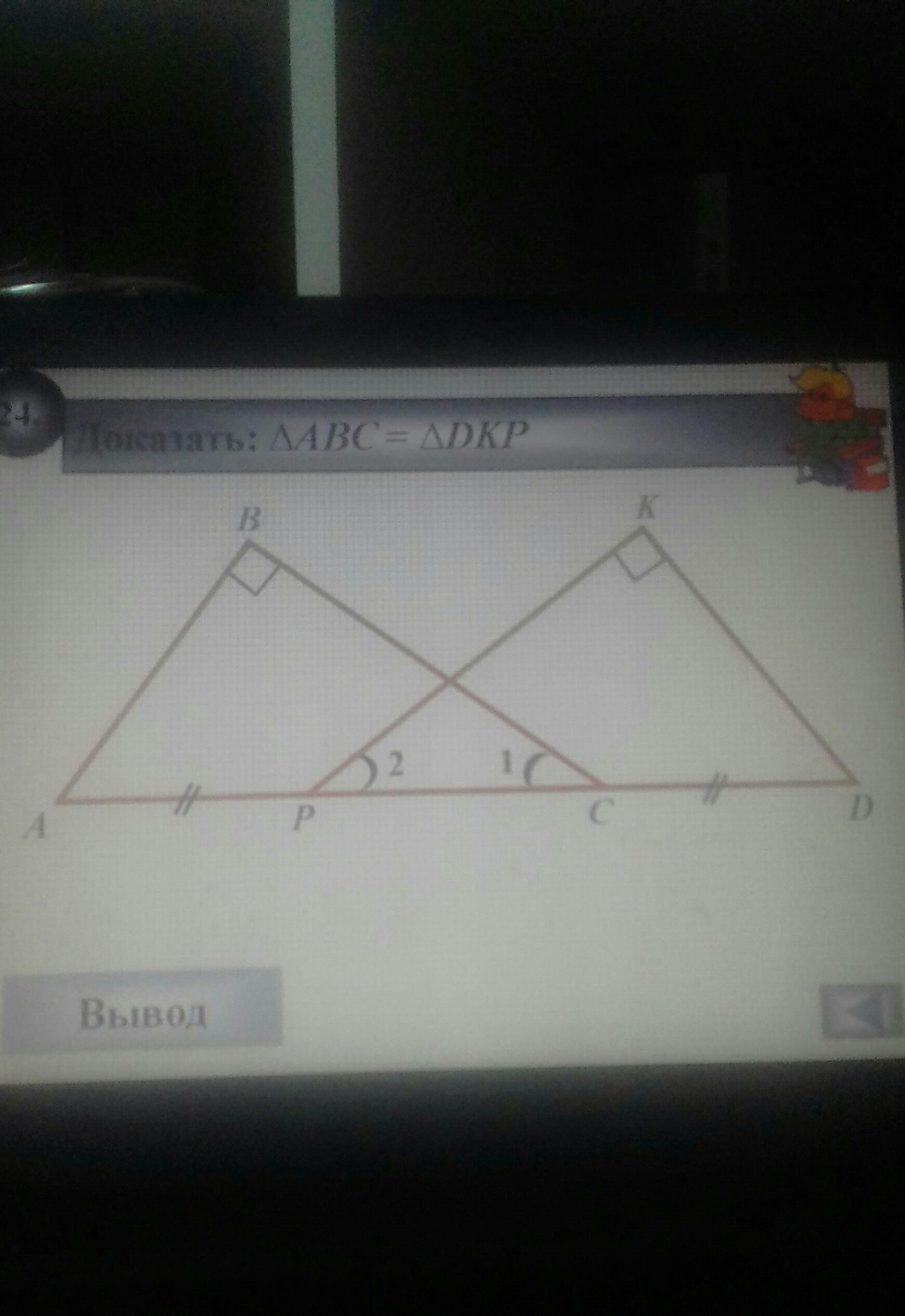 Так как угол 1 равен углу 2, то треугольник ABC=DKP по гипотенузе и острому углу