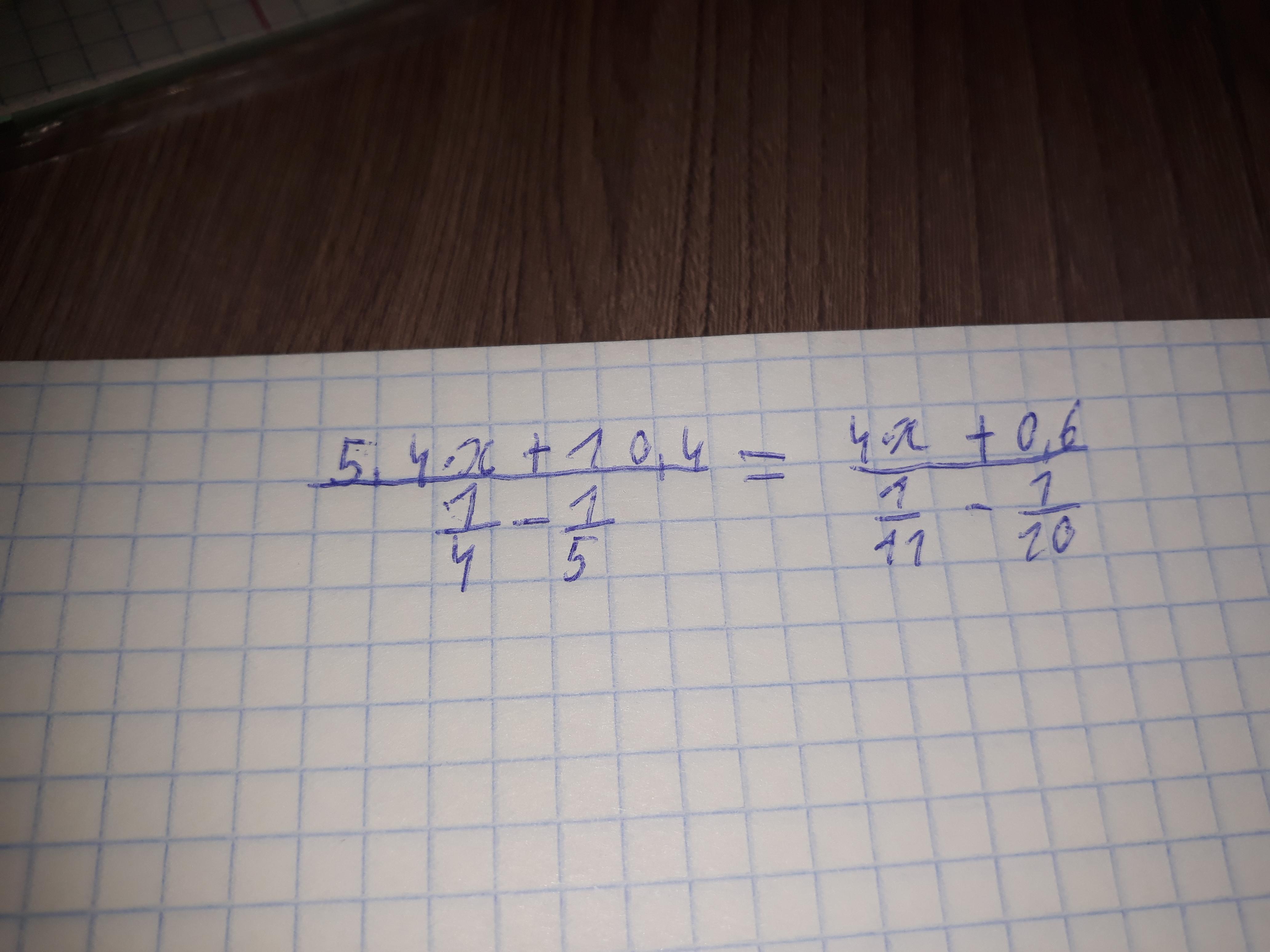 (5,4x+10,4)/(1/4-1/5)=(4x+0,6)/(1/11-1/10); (5.4x+10.4)/(5-4/20)=(4x+0.6)/(10-14/110); (5.4x+10.4)*20=4x+0.6*(-10);