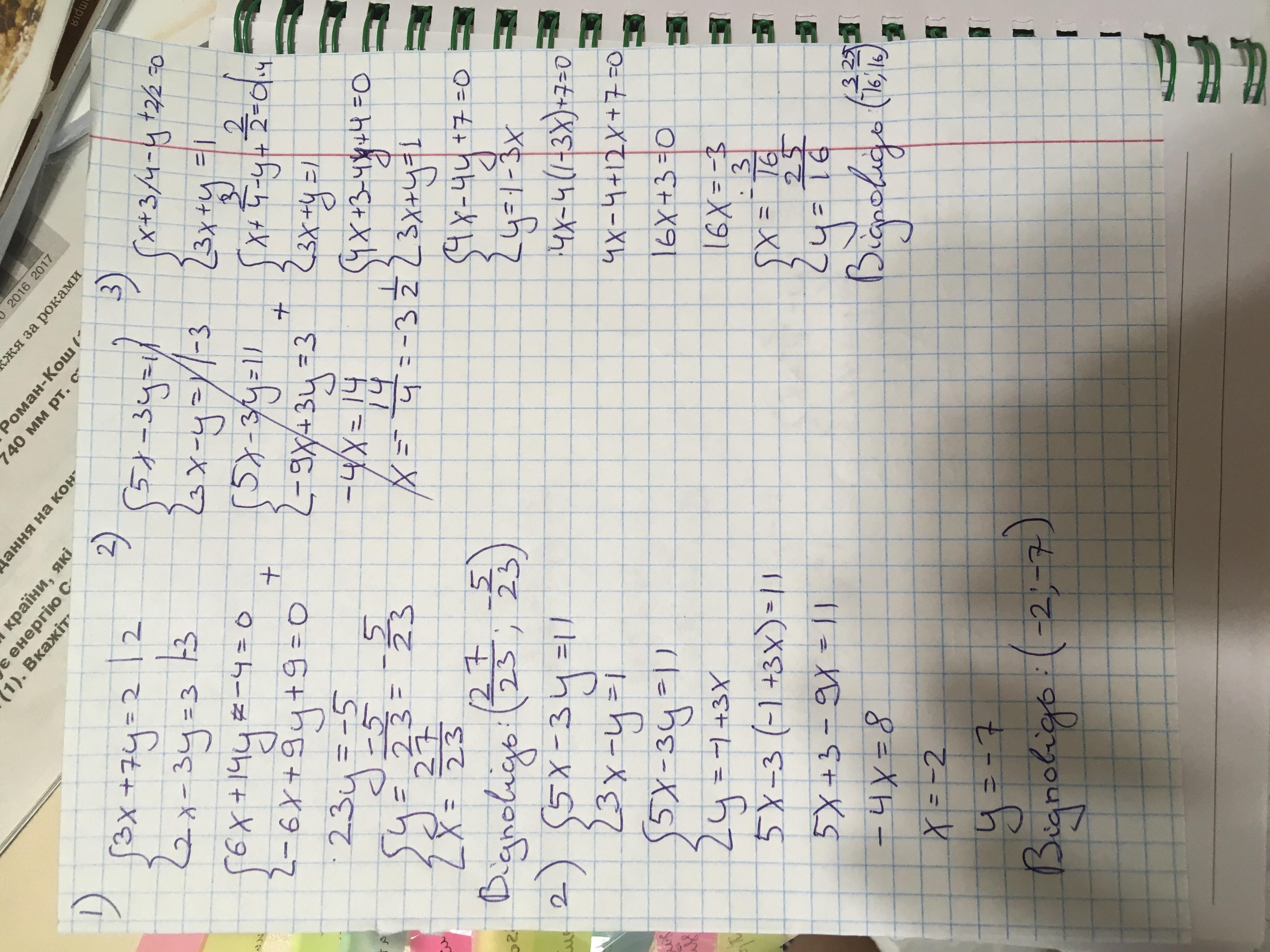 Очень срочно! Решить систему алгебраическим способом 1)3x+7y=2 2x-3y=3; 2)5x-3y=11 3x-y=1; 3)x+3/4-y+2/2=0 3x+y=1. Алгебра. Тут три системы.