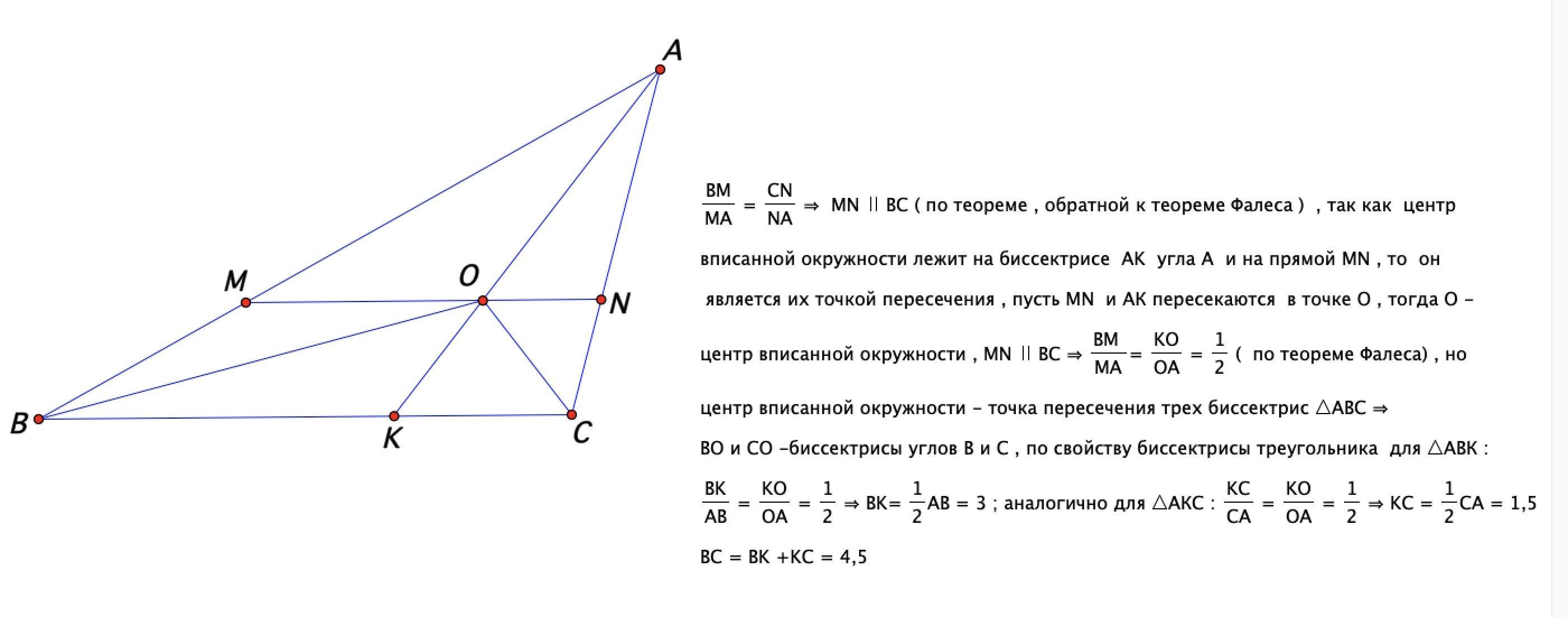 В треугольнике АBC на сторонах АВ и АС выбраны точки М и N так, что ВМ:МА=СN:NA=1:2. Оказалось , что отрезок МN содержит центр окружности , вписанной в треугольник АВС. Найдите ВС , если АВ=6 АС=3.
