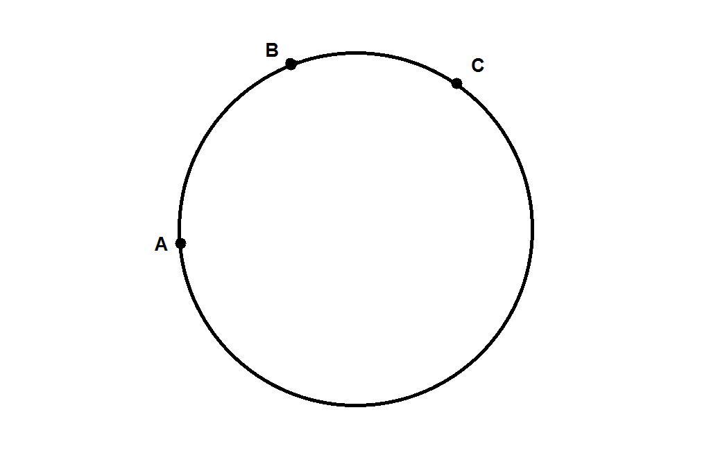 Берете угольник, в смысле прямоугольный треугольник, прикладываете вершину прямого угла к точке В, и соединяете ее с точкой А, другая сторона прямого угла пересечет окружность, например, в точке Т, поскольку прямой вписанный угол опирается на диаметр, построен диаметр АТ, аналогично, совмещая вершину прямого угла с точкой В, соединяем точки В и С, находим еще один конец, например, точку К диаметра СК, опять же помня, что вписанный прямой угол СВК опирается на диаметр. Два диаметра СК и АТ пересекаются в одной точке, например, точке О, которая и будет центром этой окружности.