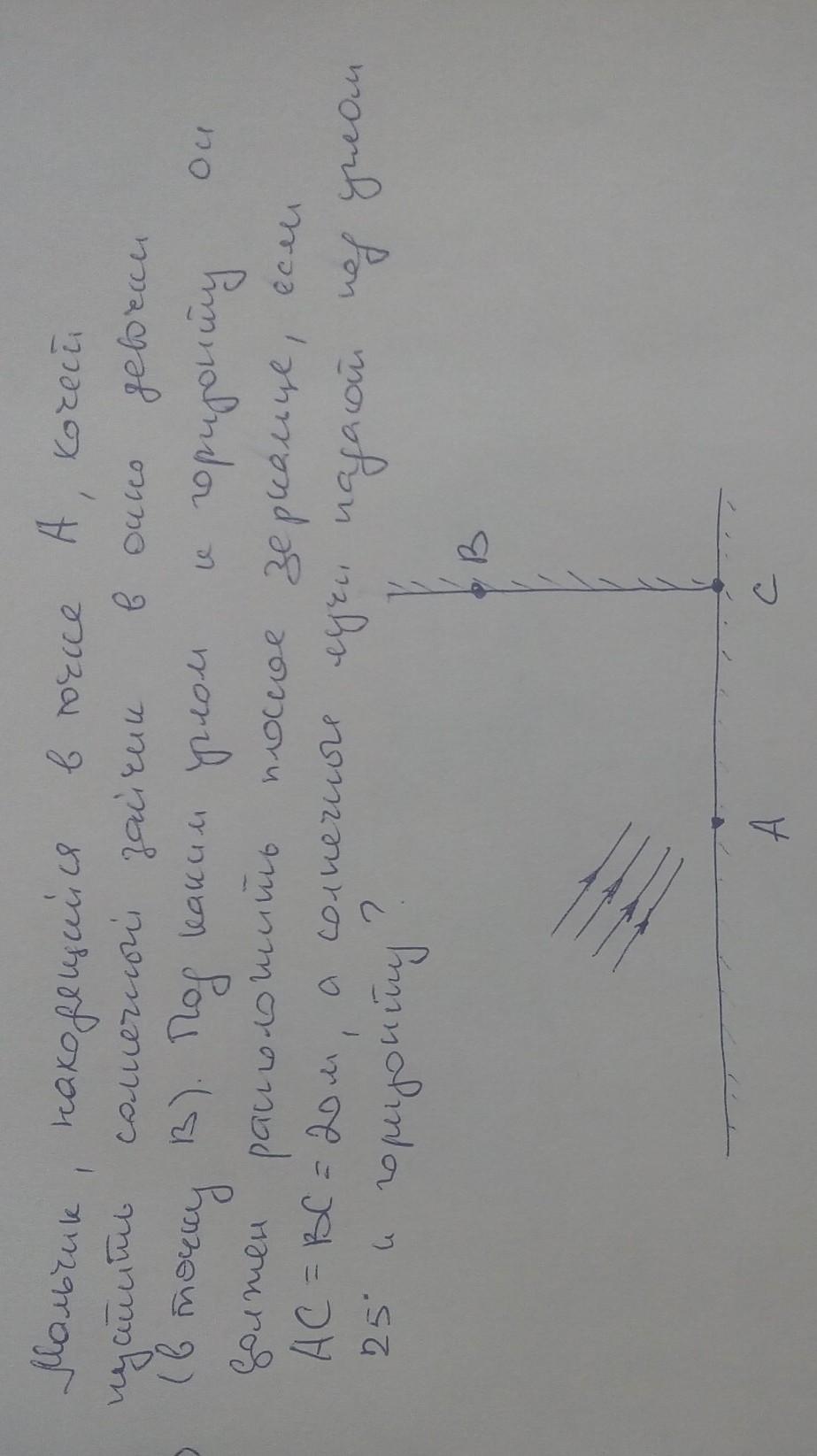 Мальчик, находящийся в точке A, хочет пустить солнечный зайчик в окно девочкам (в точку B). Под каким углом и горизонтом он должен расположить плоское зеркальце, если AC=BC=20м, а солнечные лучи падают по углом 25° и горизонту?