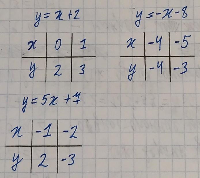 Помогите пожалуйста с заданием. С графиком я справлюсь, просто забыла как решать. Постройте график функции, заданной формулой. 1)у=х+2 2)у=-х-8 3) у=-3х+2 4) у=5х+7
