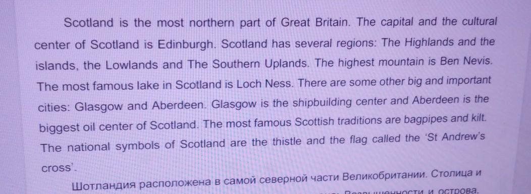 Скотлэнд ис зе мост носен парт оф грит бритэйн.Зе кэпитал энд зе калчерал сенте оф Скотленд ис Эдинбур.Скотлэнд хэз северал регионс зе хайландс энд зе айлэндс зе лоулэндс энд зе сузерн аплендс.Зе хайест маунтайн ис Бен Ньюис.