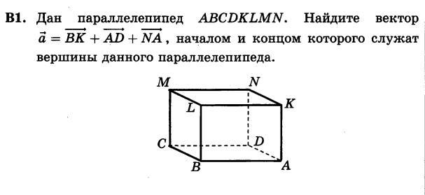 Дан параллелепипед ABCDKLMN. Найдите вектор a=BK+AD+NA, началом и концом которого служат вершины данного параллелепипеда