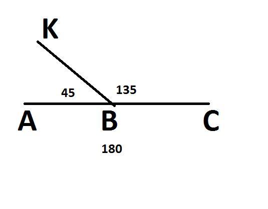Луч BK делит развернутый угол на два угла: ABC и KBC. Угол ABK в 3 раза меньше угла KBC. Найдите угол ABK и угол KBC.