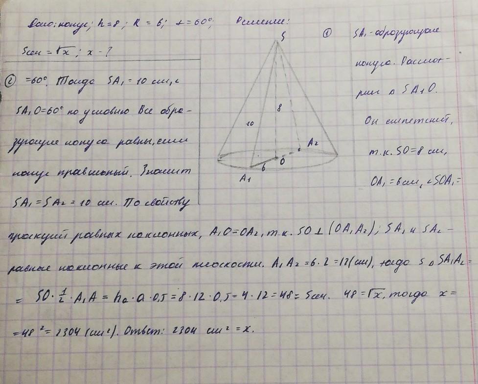 Высота конуса равна 8 радиус окружности 6 сечение конуса проходит через две образующие конуса от окружности дугу в 60 градусов площадь этого сечения корень из х найти х
