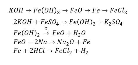 Пример: Гидроксид калия → гидроксид железа (II) → оксид железа (II) → железо → хлорид железа (II)