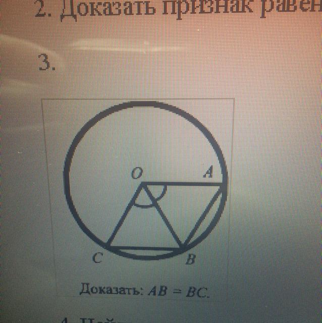 треугольник СОВ = треугольнику АОВ по двум сторонам и углу между ними (ОС=ОА - радиусы окружности; ОВ - общая сторона; угол СОВ = углу ВОА по условию) => АВ=ВС как соответственные элементы равных треугольников.