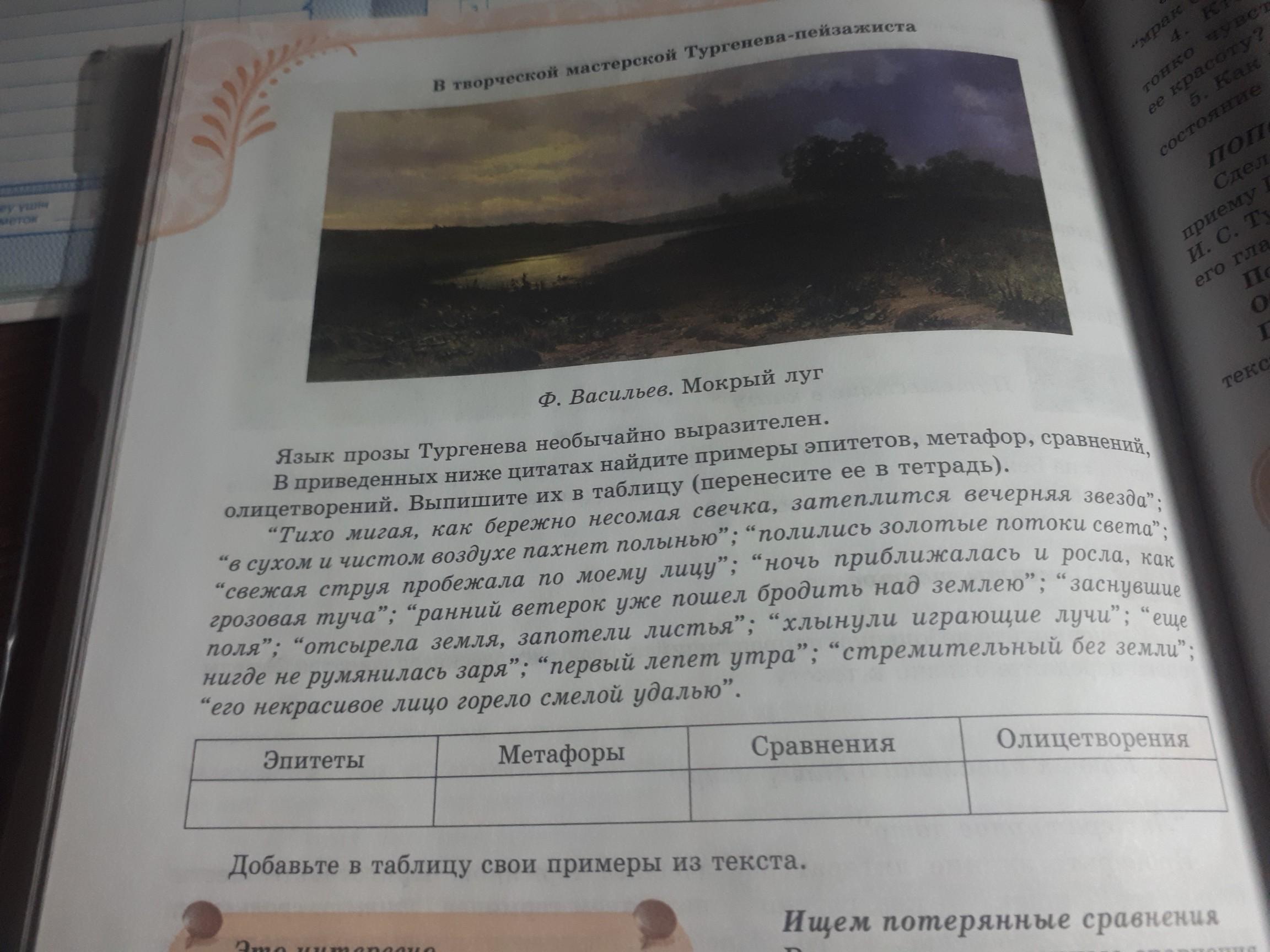 Олицетворения: ранний ветерок уже пошел бродить над землею; его некрасивое лицо горело смелой удалью; свежая струя пробежала по моему лицу; отсырела земля, запотели листья; еще нигде не румянилась заря; заснувшие поля; хлынули играющие лучи.