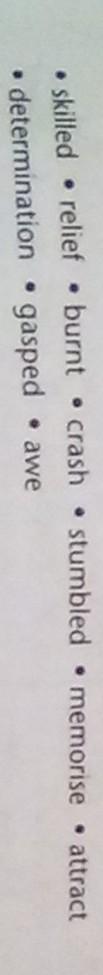 1- исскусный; 2- рельеф; 3- сожжен; 4- авария; 5- споткнулся; 6- выучить наизусть; 7- привлекать; 8- ахнула; 9- трепет.