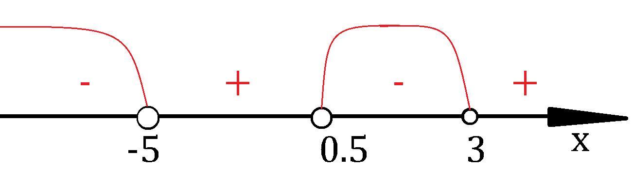 Они делят числовую прямую на интервалы: (-oo; - 5); (-5; 1/2); (1/2; 3); (3; +oo).