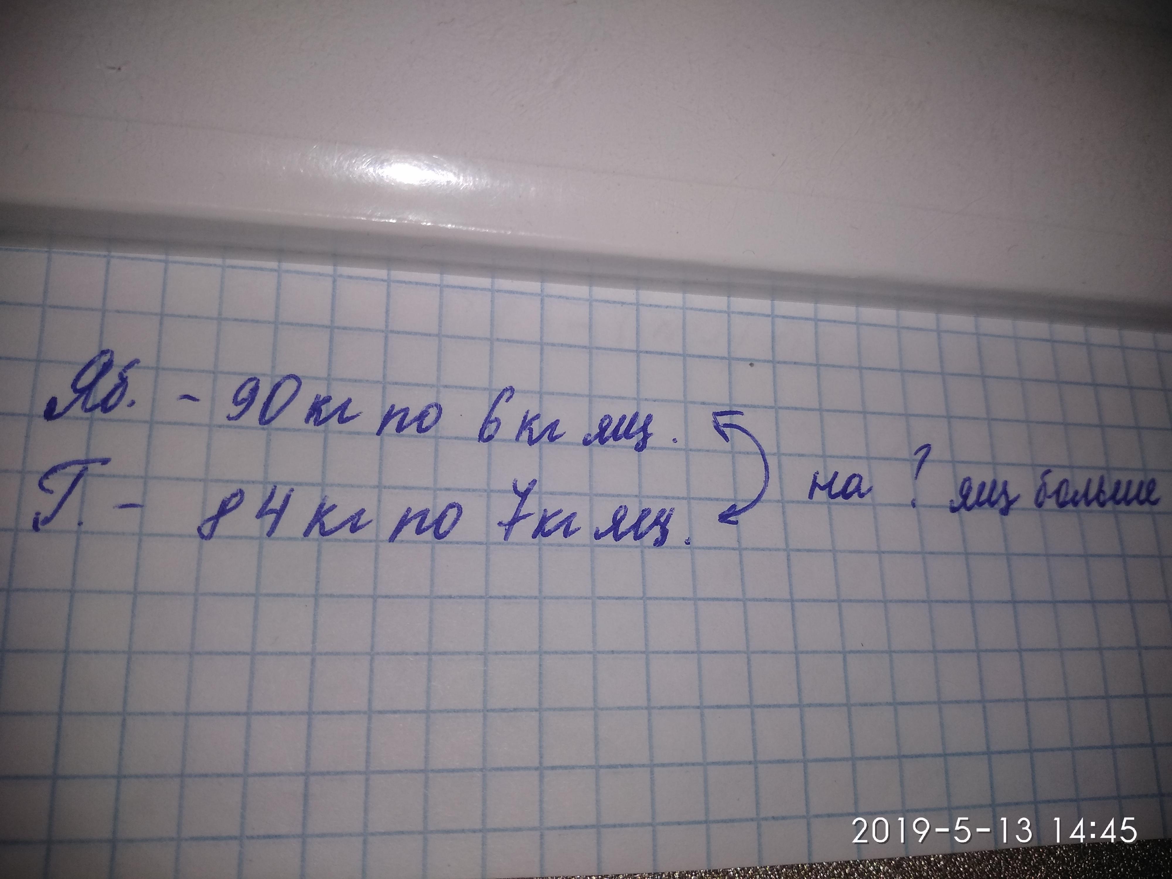 90 кг яблок разложили в ящики по 6 кг в каждом, а 84 кг гранатов- в ящике по 7 кг в каждом. На сколько ящиков с яблоками больше чем ящиков с гранатами?