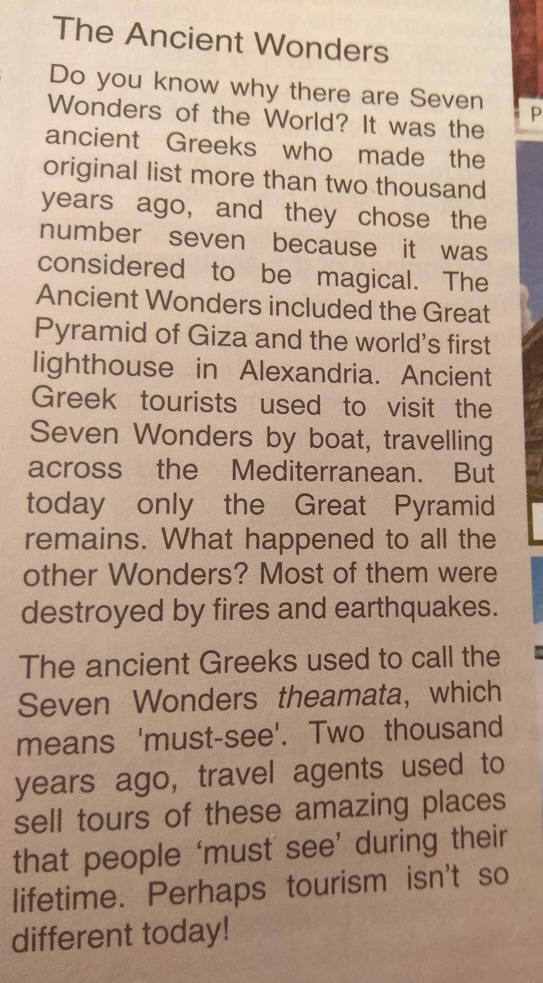 Вы знаете, почему существует семь чудес света? Это были древние греки, которые сделали оригинальный список более двух тысяч лет назад, и они выбрали число семь, потому что он считался магическим. Древние чудеса включены Великая Пирамида Гизы и первый в мире маяк в Александрии. Древних греческих туристов посетили семь чудес на лодке, путешествия по Средиземному морю. Но сегодня остается только Великая Пирамида. Что случилось со всеми прочими чудесами? Большинство из них были уничтожены в результате пожаров и землетрясений. Древние греки привыкли называть Семь чудес theamata, что значит "обязательно посмотреть". Две тысячи лет назад, турагенты продают туры в эти удивительные места, что люди "должны увидеть" в течение своей жизни. Ре һ закрытыгіsm не ЮВ сегодня!