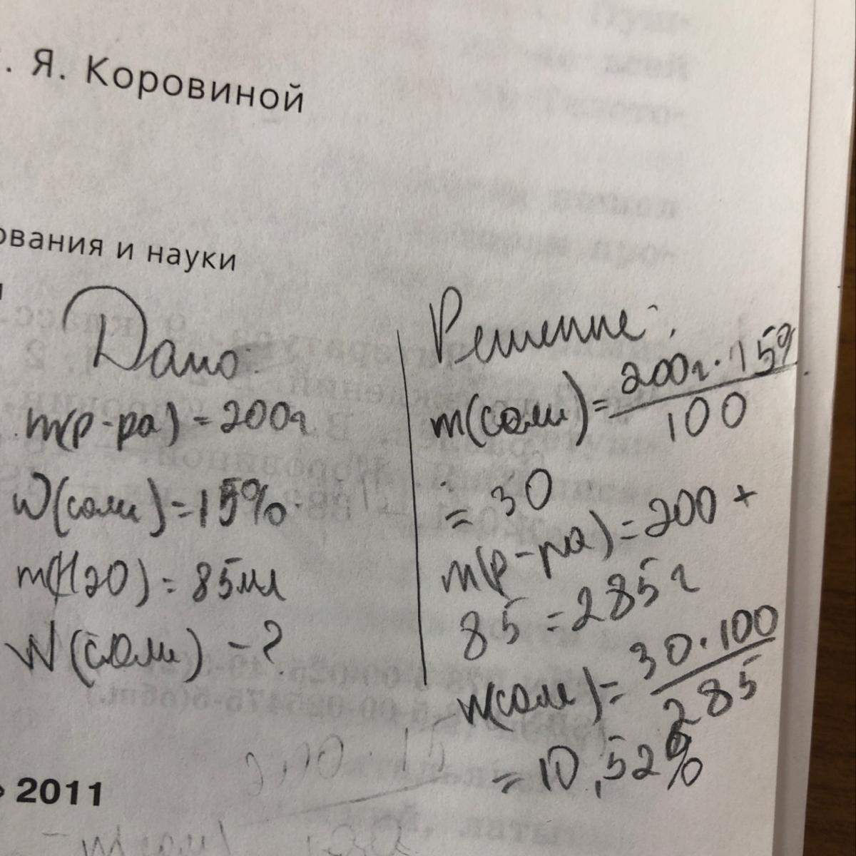 К 200г раствора соли W соли = 15% добавили 85 мл воды. Найти массовую долю в новом растворе.