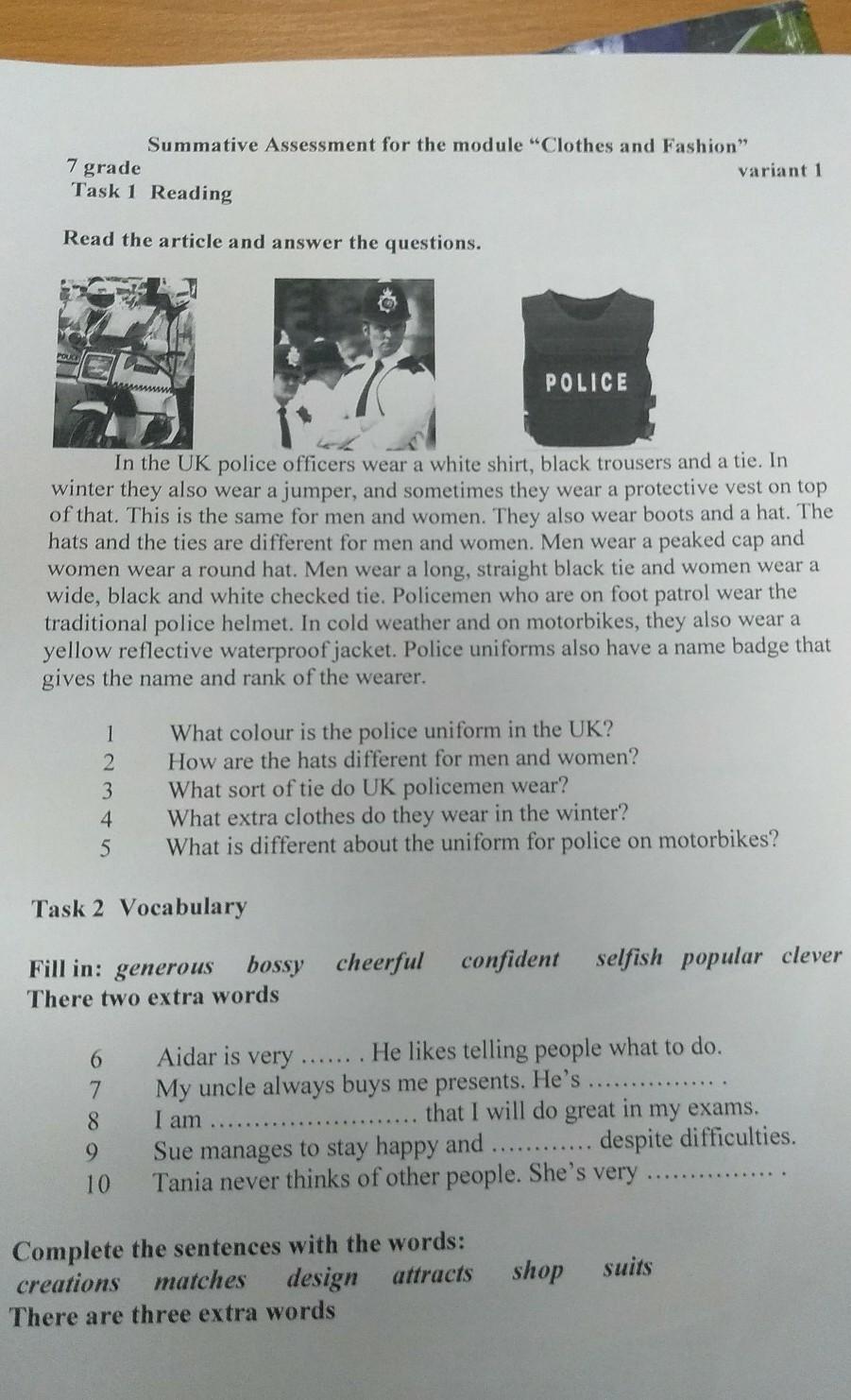 ответы 1 white and black trousers 2 men -peaked cap women round hat 3 men-long black tie women wide black and wide tie 4 jamper and protective vest 5 waterproof jacket