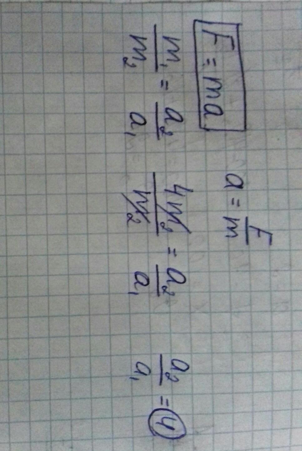 F=ma, a2/a1=(F2/m2)*(m1/F1)== 4*m2/m2= 4 -ответ