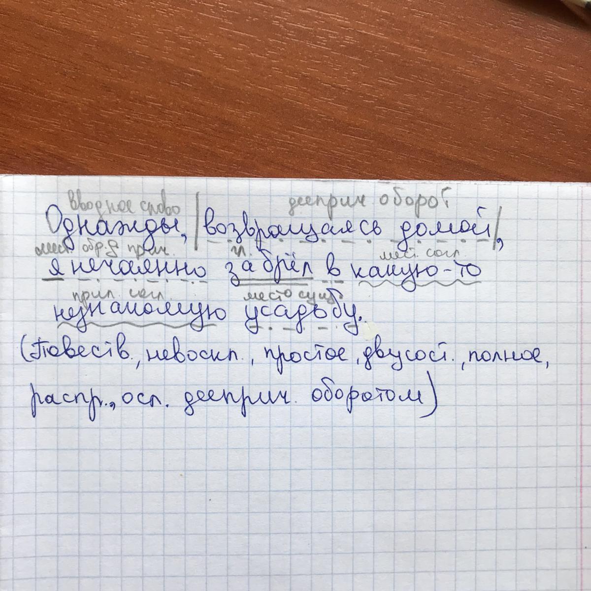 Однажды-вводное слово, возвращаясь домой - деепричастный оборот, я - подлежащее, выраженное существительным, Забрёл – сказуемое выражена глаголом, нечаянно обстоятельства образа действия выраженное наречием, Какую-то – согласованное определение выраженное местоимением, Не знакомую – согласованное определение выраженное прилагательным, в усадьбу – обстоятельства места выраженное существительным с предлогом