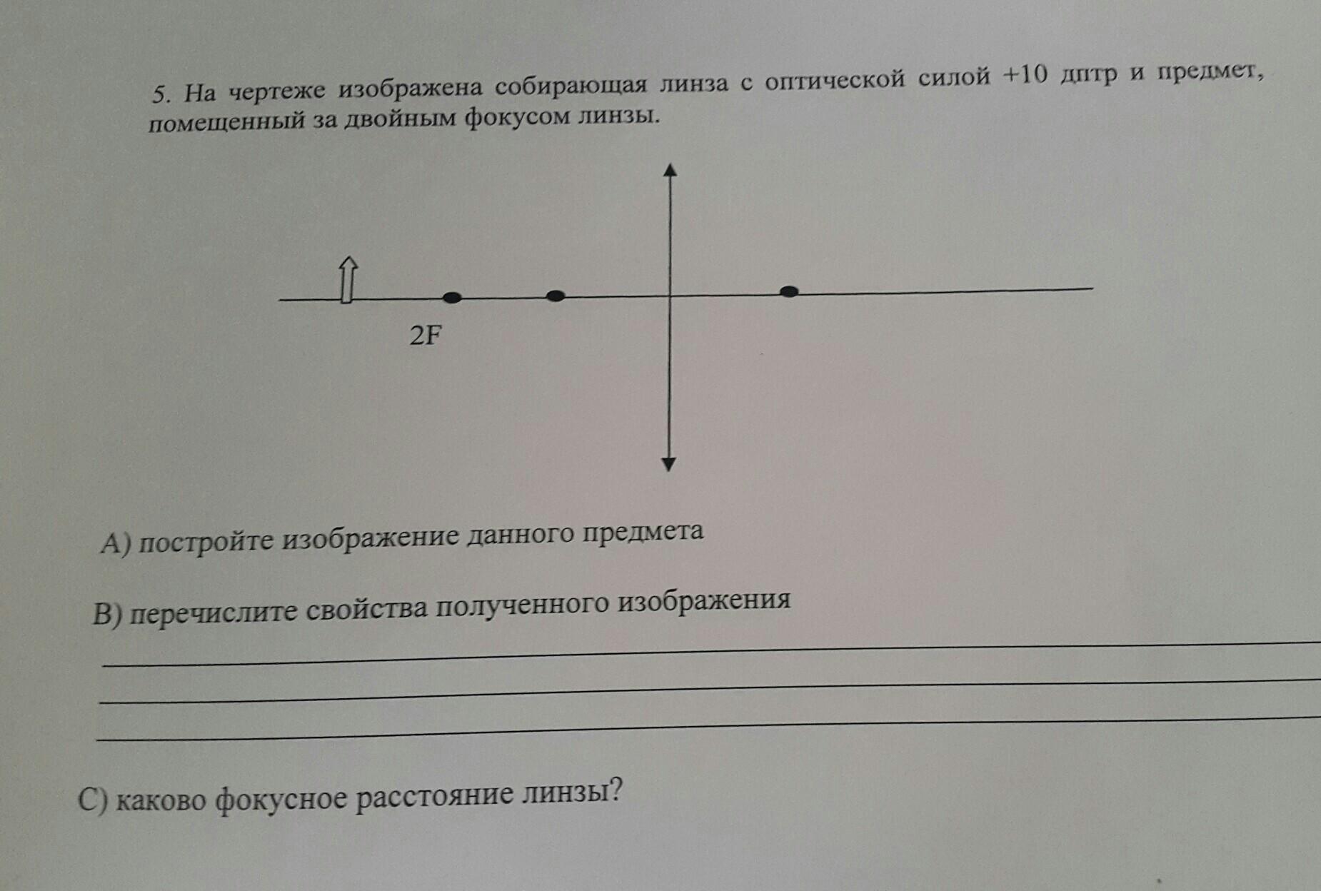 второй параллельно оптической оси и через линцу преломление через фокус - где пересекутся (ниже линии оси) там изображение вершины - основание перпендикуляр из вершины к оси