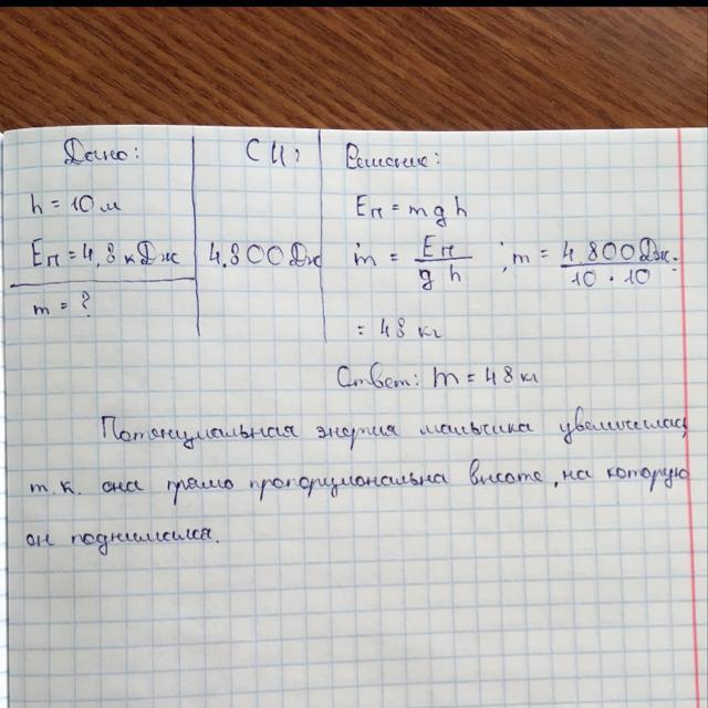 ❖ ❖ Чему равна масса мальчика, если при подъёме по лестнице дома на 10 м его потенциальная энергия изменилась на 4,8 кДж? Увеличилась или уменьшилась его потенциальная энергия?❖ ❖