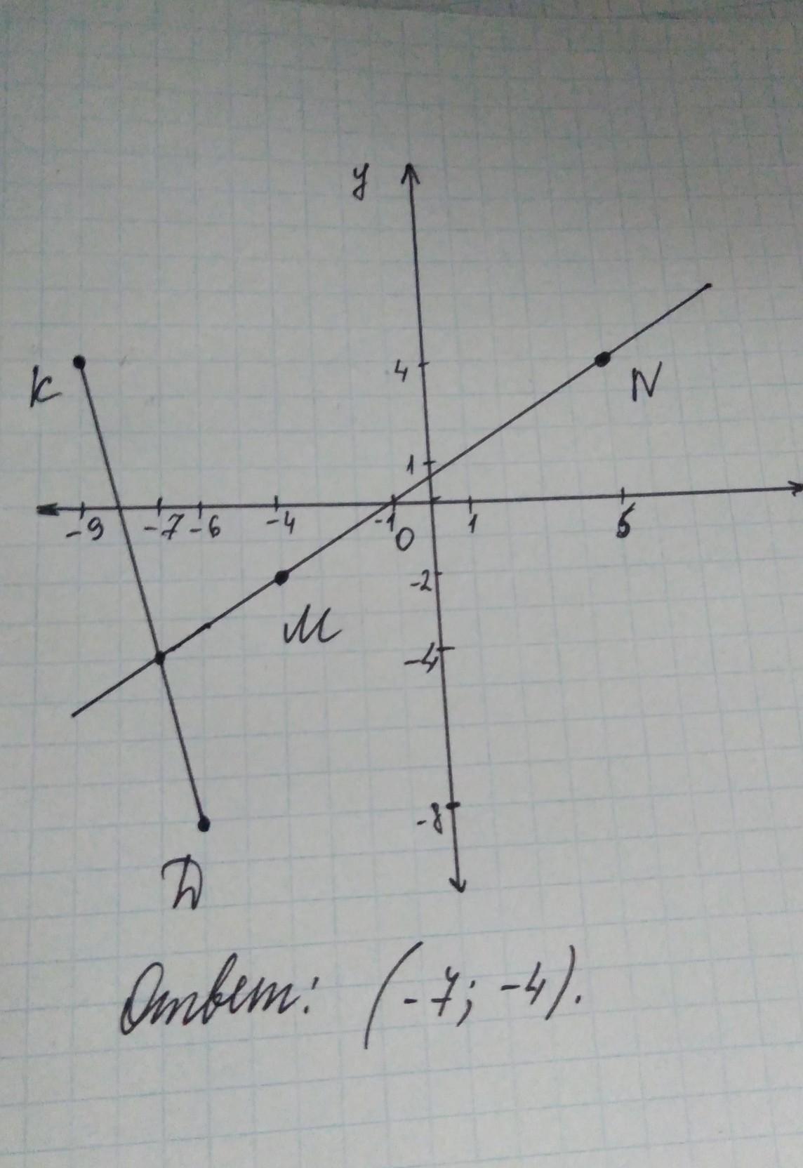 Отметьте в координатной плоскости точки м(-4,-2),н(5,4),к(-9,4_д(-6,-8) Проведите прямую мн и отрезок кд.Найдите координаты точки пересечения данных геометрических фигур.Ребят!Прошу вас!Сделайте это на листочке,начертите!УМОЛЯЮ!Я ничего в этом не понимаю!!ПРОШУ!