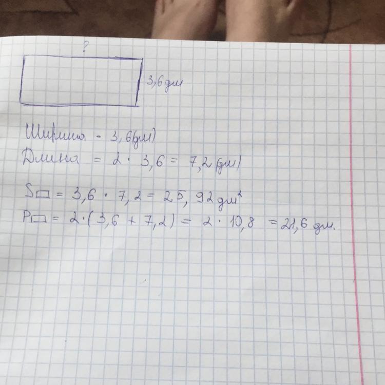 Ширина прямоугольника 3,6 дм. Длина прямоугольника в два раза больше. Найти периметр и площадь прямоугольника