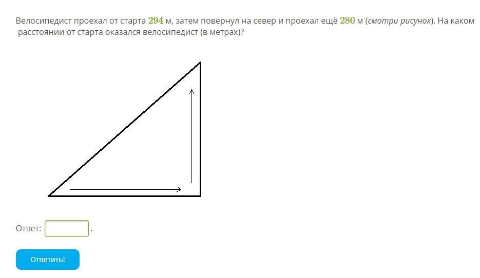 Велосипедист проехал от старта 294 м, затем повернул на север и проехал ещё 280 м (смотри рисунок). На каком расстоянии от старта оказался велосипедист (в метрах)?