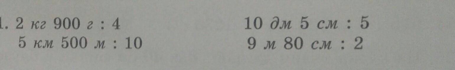 1. 2 кг 900 г = 2 900 г 2 900 : 4 = 725 г2. 5 км 500 м = 5 500 м5 500 : 10 = 550 м3. 10 дм 5 см = 105 см105 : 5 = 21 см4. 9 м 80 см = 900 080 см