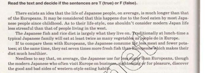 Прочитайте текст и решите, являются ли предложения T (true) или F (false). Существует мнение, что жизнь японцев в среднем намного дольше, чем у европейцев. Можно предположить, что это происходит из-за пищи, которую съедает большинство японцев с детства. Что касается их образа жизни, то не следует воспринимать жизнь современной Японии менее напряженно, чем жизнь людей, живущих на западе. Японская рыба и рисовая диета - в основном то, чем они живут. Традиционно в обеденный перерыв в Европе. типичная японская семья съедает как минимум вдвое больше овощей. Если сравнивать их с европейцами, японцы потребляют пальцы; в то же время они едят в семь раз больше свежей рыбы, питаясь гораздо здоровее и меньше, чем европейцы, делают это меньше, чем европейцы, хотя ради удовольствия обнаруживают, что само собой разумеется, что в среднем японцы используют гораздо больше современных японцев, которые часто посещают Европу на Бизе хорошие и плохие стороны западного стиля едят хаби