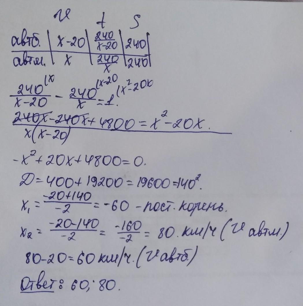 Из одного города в другой, расстояние между которыми равно 240 км, выехали одновременно автобус и автомобиль.Автобус двигался со скоростью на 20км/ч меньше, чем автомобиль и прибыл в пункт назначения на 1 ч позже автомобиля.Найдите скорость автомобиля и скорость автобуса