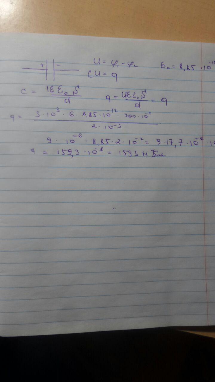 Плоский конденсатор состоит из двух пластин площадью 200 см2 каждая, расположенных на расстоянии 2 мм друг от друга, между которыми находится слой слюды (диэлектрическая проницаемость слюды равна 6). Чему равен заряд, сообщенный конденсатору, если напряжение между пластинами 3кВ?