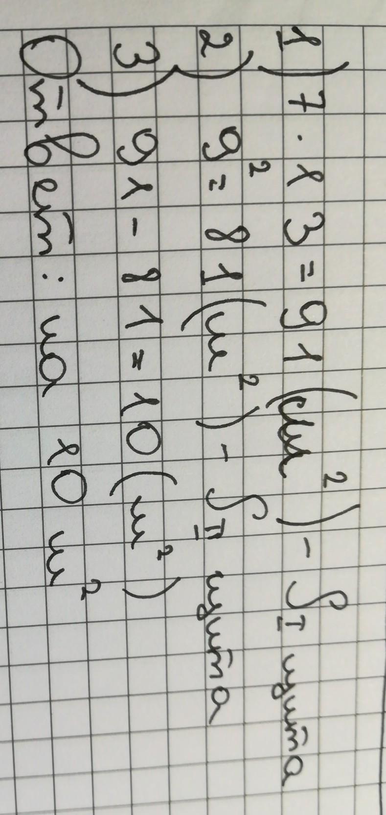 В школьный спортзал купили 2 щита. На сколько площадь прямоугольного щита длинна которого 13 м. ширина 7 м. больше площади квадрата со стороной 9м