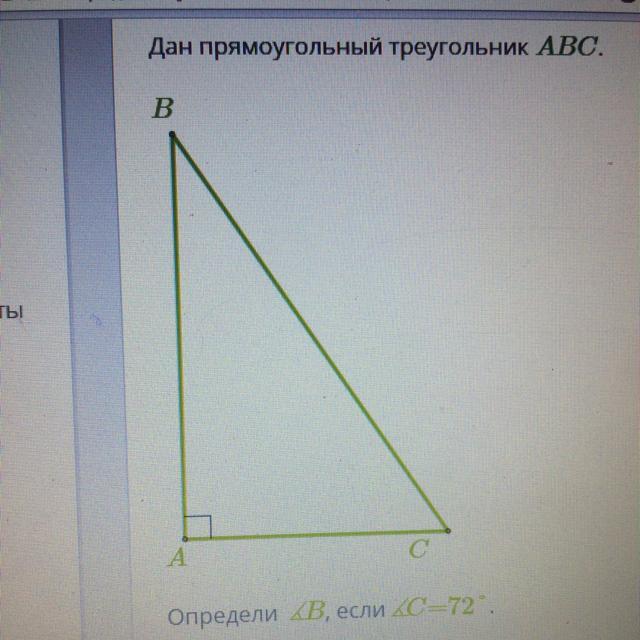 Ответ:угол В=90-72=18, так как в прямоугольном треугольнике на два острых угла приходится 90 градусов