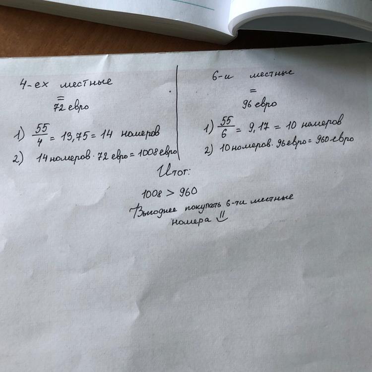 В гостинице четырёх и шести местные номера.Какие номера выгоднее заказать группе туристо из 55 человек,если четырёх местный номер за сутки стоит 72 евро,а шести местные номер 96 евро?