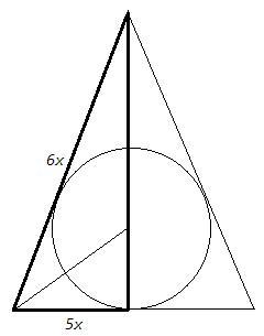 Центр вписанной окружности - точка пересечения биссектрис. Высота к основанию равнобедренного треугольника является биссектрисой и медианой. Биссектриса делит сторону треугольника в отношении прилежащих сторон. Следовательно боковая сторона (a) и половина основания (36) относятся как 6:5.